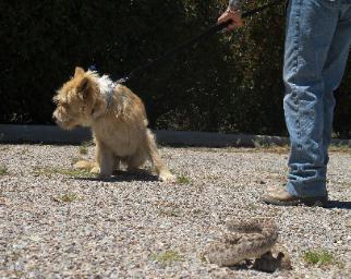 | Thanks Roger, the snake training paid off. About 8:30 one Saturday evening in September, I let my two dogs, Bosco and Emily, outside to take care of business before they received their night-time treat and went to the kennels for the night. The pair had just gone out the door when they quickly turned and ran back inside. I picked up a flashlight and went out to see a rattlesnake had made its way inside our brick wall and was lying coiled next to one of the bistro chairs. Wow, the dogs had heard the rattle of the snake, smelled it, or both and knew exactly what to do. I called the Green Valley Fire Dept who came out to our house and retrieved the snake and took it away. Knowing it was safe and the snake was gone, I tried to get Bosco and Emily to go back out but they would have no part of it. At least not that night. Again, both Mary and I would like to thank you for the fine training you provide. It really paid off for our two dogs. Mike H. Green Valley, AZ |